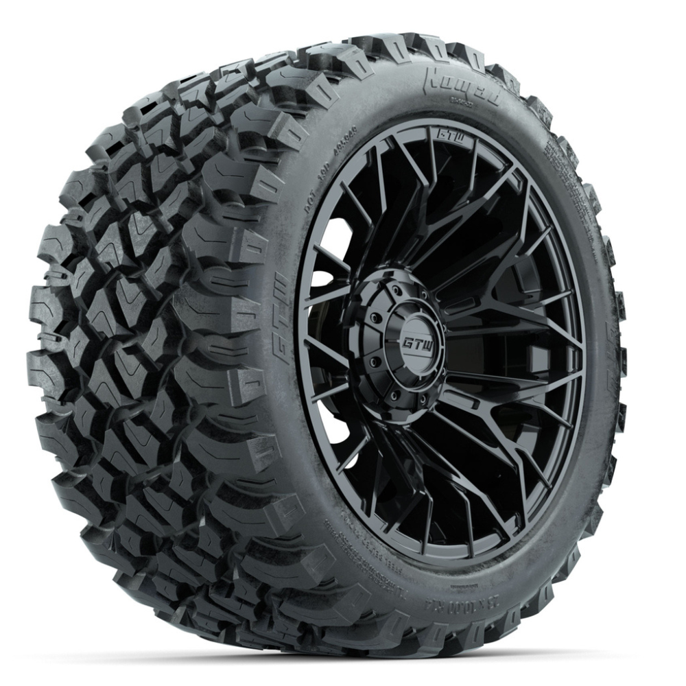 A set of (4) 14-inch GTW® Stellar Matte Black golf cart wheels on 23x10-R14 GTW® Nomad All-Terrain Tires