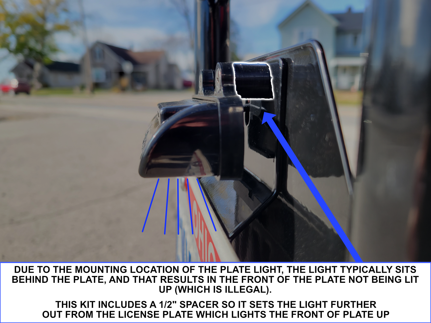 - Includes spacers to space the light out so it actually shines on the license plate (typically doesn't shine on the front in most mounting applications)
